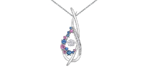 10k white gold canadian diamond and multi colored sapphire pendant.1 Canadian diamond #MLR340338 0.31ct 2 ceylon sapphires 3mm 1 pink sapphire 3mm 3 pink sapphires 2mm 2 ceylon sapphires 2mm 3 ceylon sapphires 1.5mm 1 pink sapphire 1.5mm